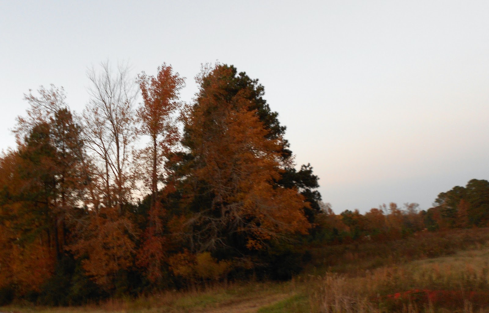 with its pale sky, burnt-orange leaves, and tawny ground.
